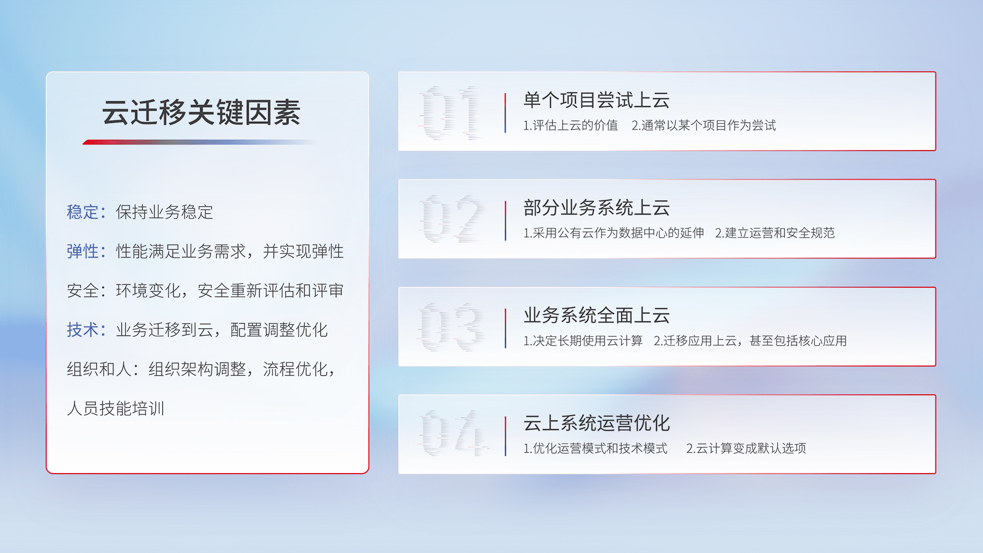 结合实际业务,,,从规划设计、、、、云平台选型、、云原生改造、、、数据迁移、、、、集成交付,,,,迁移全过程为客户识别最佳上云路径,,,,做好风险识别管理,,设计网络架构、、、身份权限、、、安全审计合规、、操作审计、、、、日志审计、、监控告警策略、、多站点容灾设计等,,对云上基础设施进行整体规划,,,,提升IT治理水平,,以满足弹性、、、、高可用、、、高性能的需求。。。